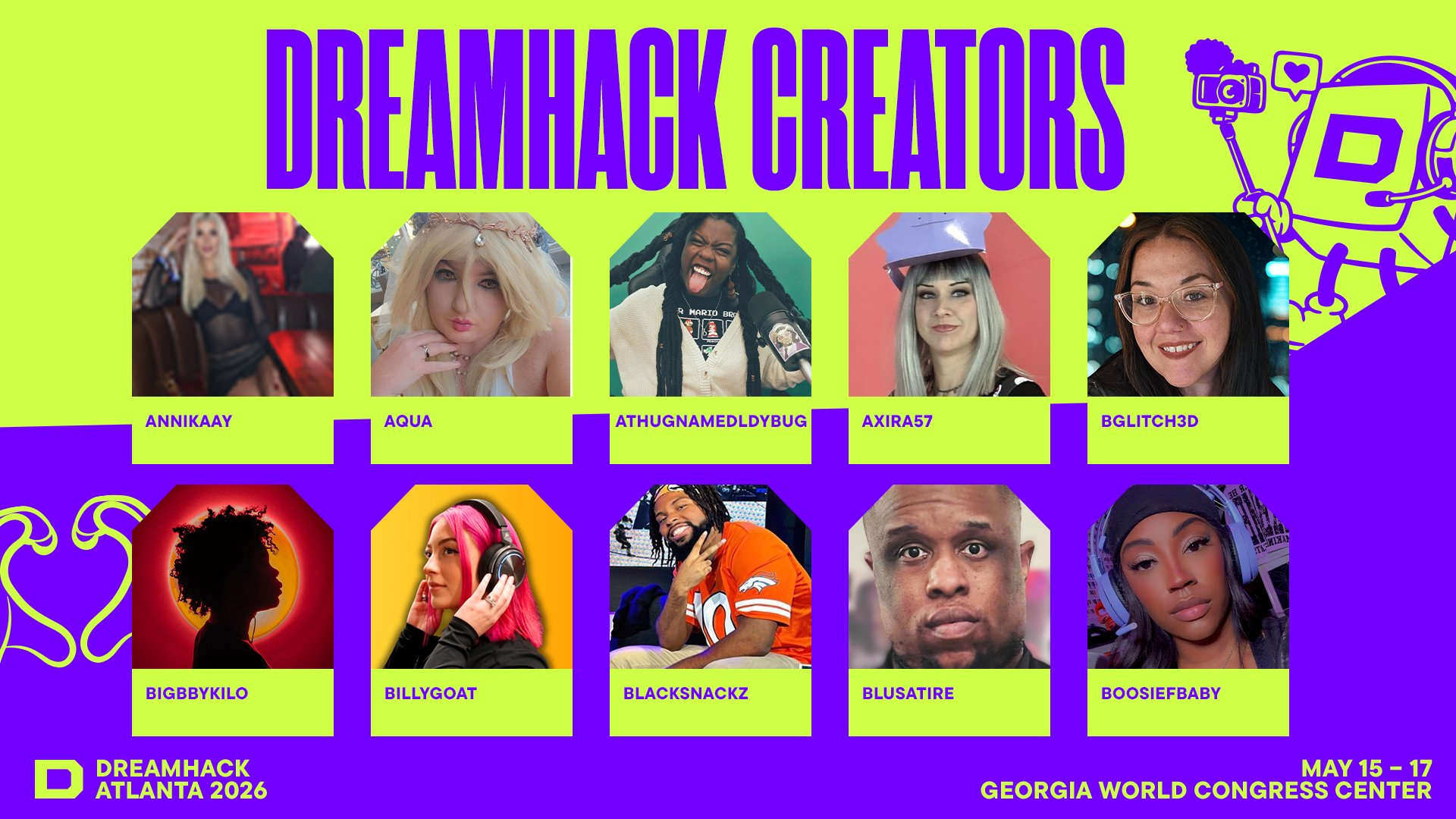 DreamHack has announced a huge wave of content creators confirmed for DreamHack Atlanta 2026, taking place May 15–17 at the Georgia World Congress Center. The roster spans streamers, gamers, cosplayers, and community creators from across the US and beyond.