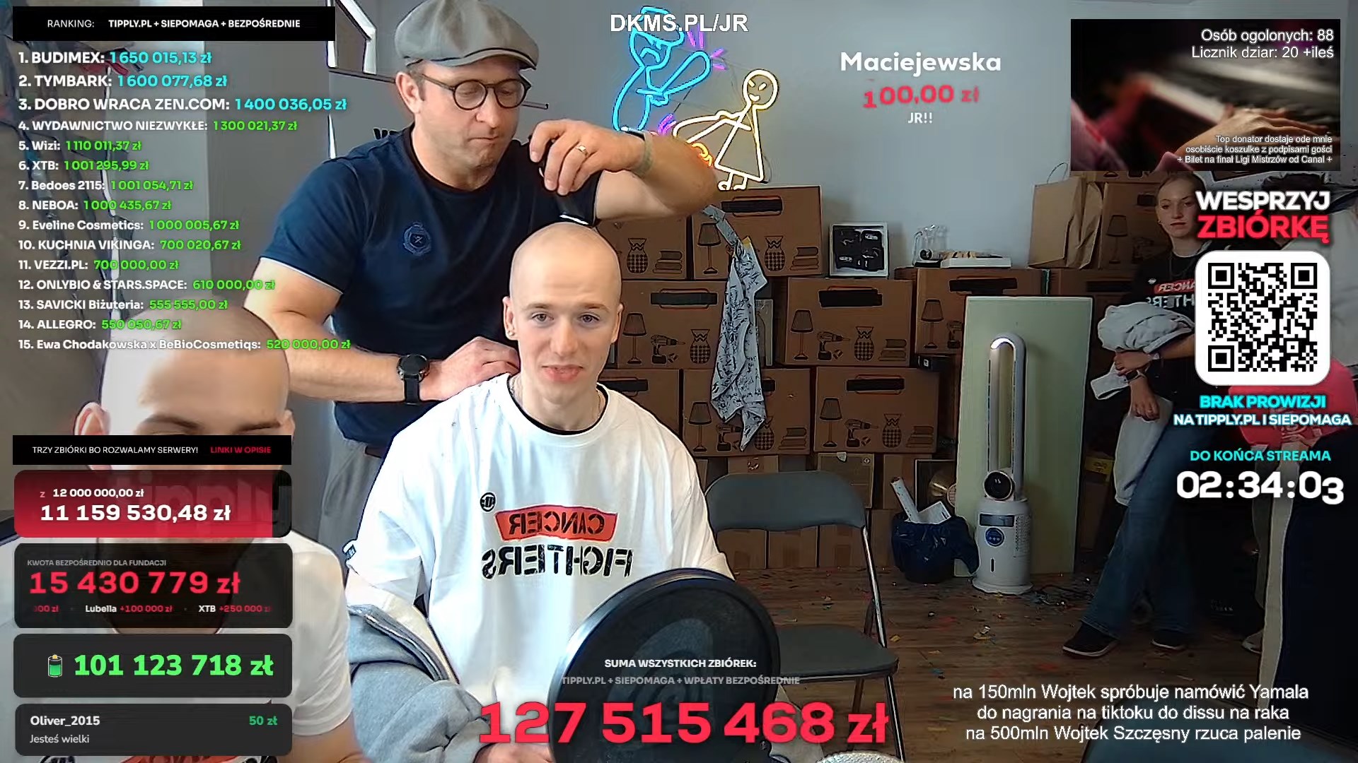 Head-shaving became the defining visual ritual of the stream. Actress Edyta Pazura pledged to shave her head once donations hit 50 million złoty — and her husband, beloved actor Cezary Pazura, was the one holding the razor. Streamer Kasix, who survived a stroke at 25, had grown her hair for five years before shaving it at the 13 million złoty milestone. Fashion blogger Maffashion joined remotely from Marbella and shaved her head live once the counter crossed 46.25 million złoty.